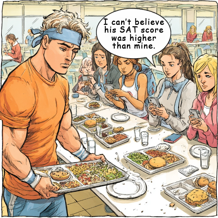 Young females having lunch with their mobile phones in hand cannot believe the school’s football star now gets higher test scores. Thanks, Midjourney. Good enough.