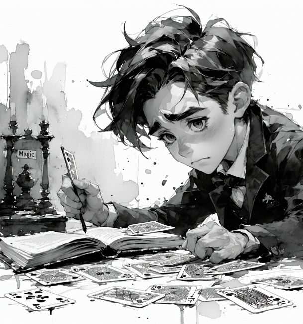 A young would-be magician struggles to master a card trick. He is worried that he will fail. Thanks, Venice.ai. Good enough.