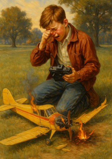 A young wizard built a wonder model aircraft. But it caught on fire and is burning. This is sort of sad. Thanks, ChatGPT. Good enough.