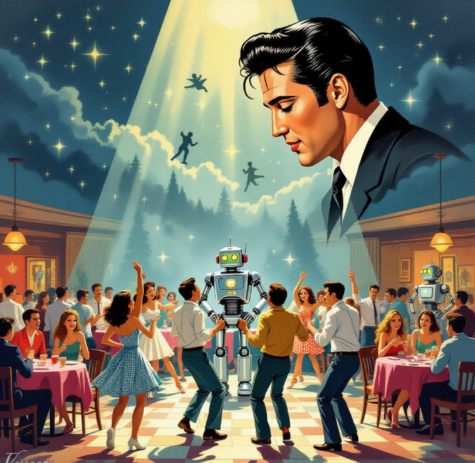 Elvis in heaven looks down on a college dance party and realizes that he has been replaced by a robot. Thanks, Venice.ai. Wow, your outputs are deteriorating in my opinion.