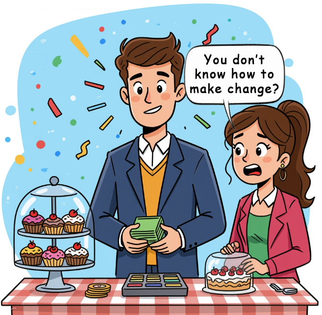 Have those laptops, tablets, and mobile phones made retail workers adept at making change? Thanks, Venice.ai. Good enough.