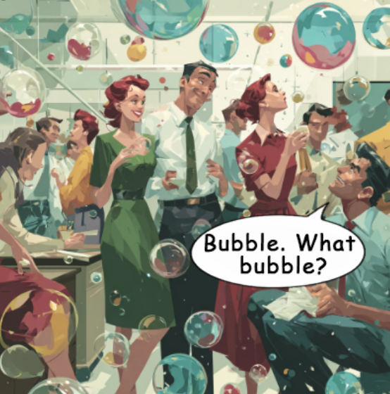 Financial professionals in Manhattan enjoy the AI revolution. They know there is no bubble. I see bubbles (plural). Thanks, MidJourney. Good enough.