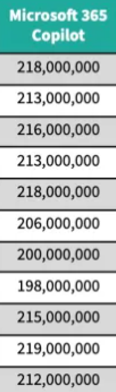 Then there is the issue of number of customers. We are now shifting from the impression some may have that these numbers represent individual humans to the fuzzy notion of app events. Why does this matter? Google and Microsoft have many more corporate and individual users than the other firms combined. If Google or Microsoft pushes or provides free access, those events will appeal to the user base and the number of “events” will jump. The data narrow Microsoft’s AI to Microsoft 365 Copilot. Google’s numbers are not narrowed. They may be, but there is not metadata to help me out. Here’s the Microsoft column: