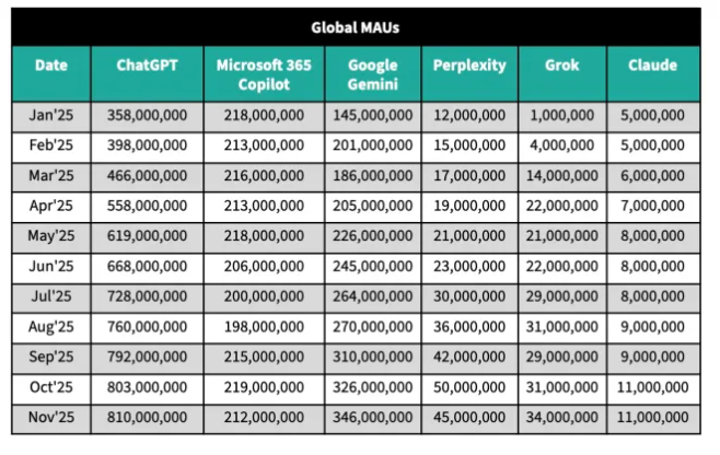 Gemini is also increasing its share of the overall AI chatbot market when compared across all top apps like ChatGPT, Copilot, Claude, Perplexity, and Grok. Over the past seven months (May-November 2025), Gemini increased its share of global monthly active users by three percentage points, the firm estimates.