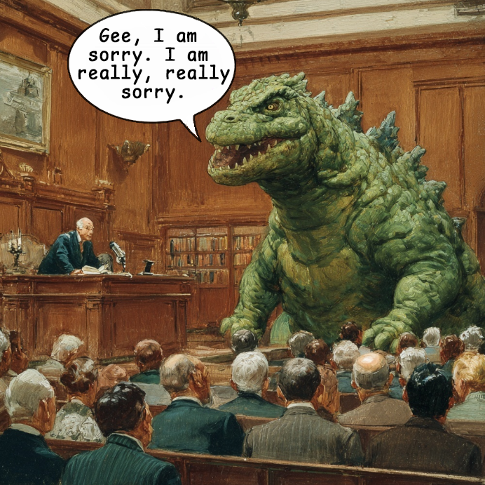 The mythical creature Googzilla apologizes to an august body for a mistake. Googzilla is very, very sincere. Thanks, MidJourney. Actually pretty good this morning. Too bad you not consistent.