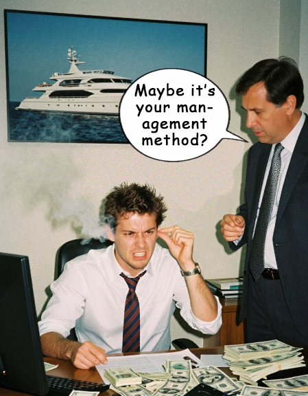 A young executive with oodles of money hears an older person, probably a blue chip consultant, asking one of those probing questions about a top dog’s management method. Will this top dog listen or just fume and keep doing what worked for more than a decade? Thanks, Qwen. Good enough.