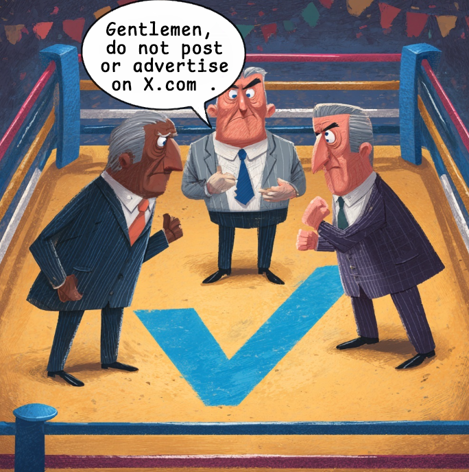I almost forgot. The root issue is the blue check one can receive or purchase to make a short message more “valid.” Next we jump to a fine, which is certainly standard operating procedure for entities breaking a law in the EU and then to a capitalist company refusing to sell ads and finally to a linkage to tariff rates.